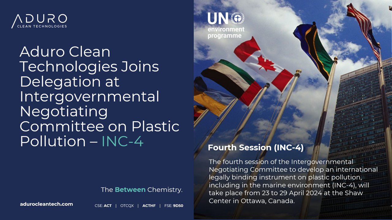 Aduro Clean Technologies Inc. (“Aduro” or the “Company”)  a Canadian technology company using the power of chemistry to transform lower value feedstocks, like waste plastics, heavy bitumen, and renewable oils, into resources for the 21st century, is joining a delegation of observers from civil society, environmental groups, academics and business at the fourth meeting of the Intergovernmental Negotiating Committee on Plastic Pollution (INC-4) in Ottawa, Ontario, Canada from April 23rd to 29th, 2024.